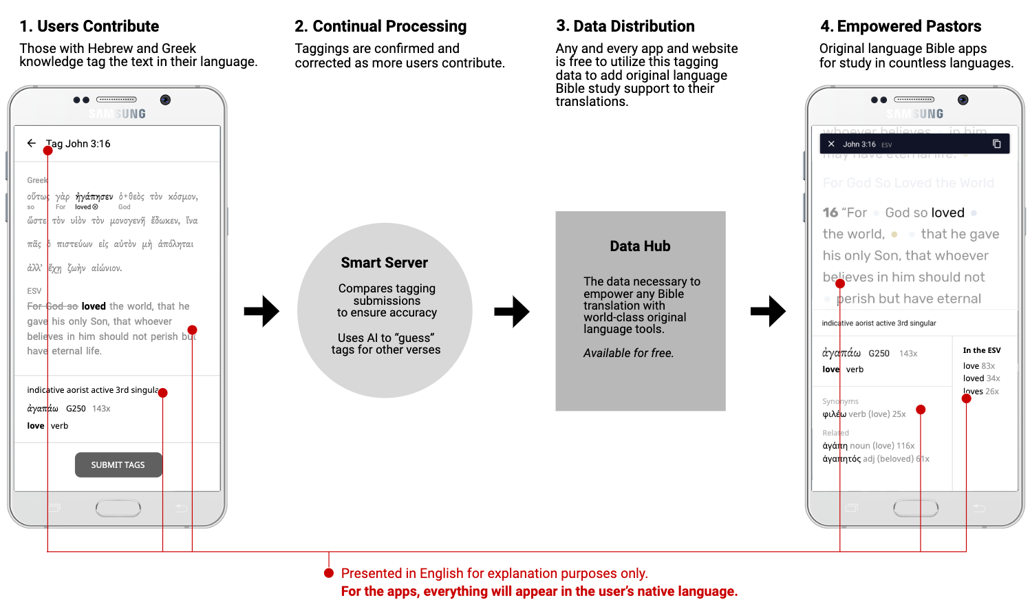 We have created a tagging module within the The Biblearc Study Bible with the capacity to utilize and contribute to tagging data. This app is completely free, fueling an ever-expanding hub of original language tagging data—which also will be freely available to all. Through innovative crowdsourcing techniques, this project will produce data for any and every Bible translation. As this happens, the app will become a more and more powerful tool for original language Bible study for pastors around the world.